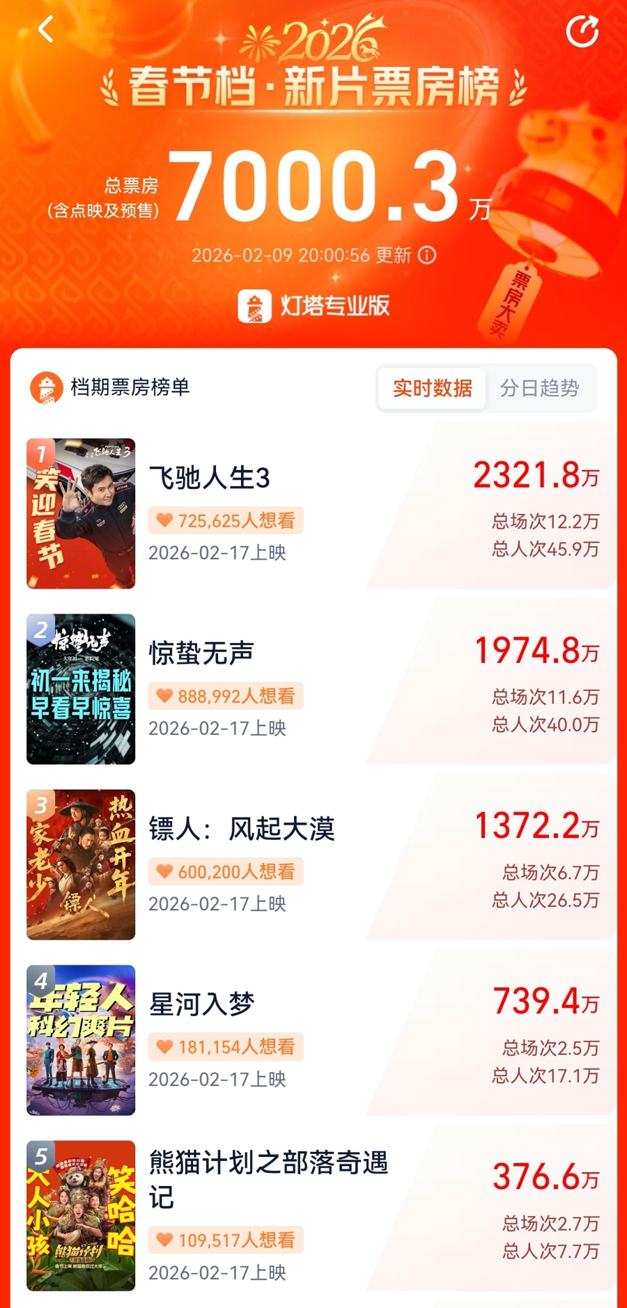 春节档影片2月9日开启预售,据灯塔专科版数据,罢休当日20时,预售票房破7000万元,电影《疾驰东说念主生3》领跑。2026年春节休假9天,也让本年春节档成为“史上最长”,罢休刻下,已有8部影片定档,包括《惊蛰无声》《疾驰东说念主生3》《镖东说念主:风起大漠》《熊出没·年年有熊》《银河入梦》《熊猫筹备之部落奇遇记》6部新片,重映影片《重返·狼群》、分线刊行的《夜王》。