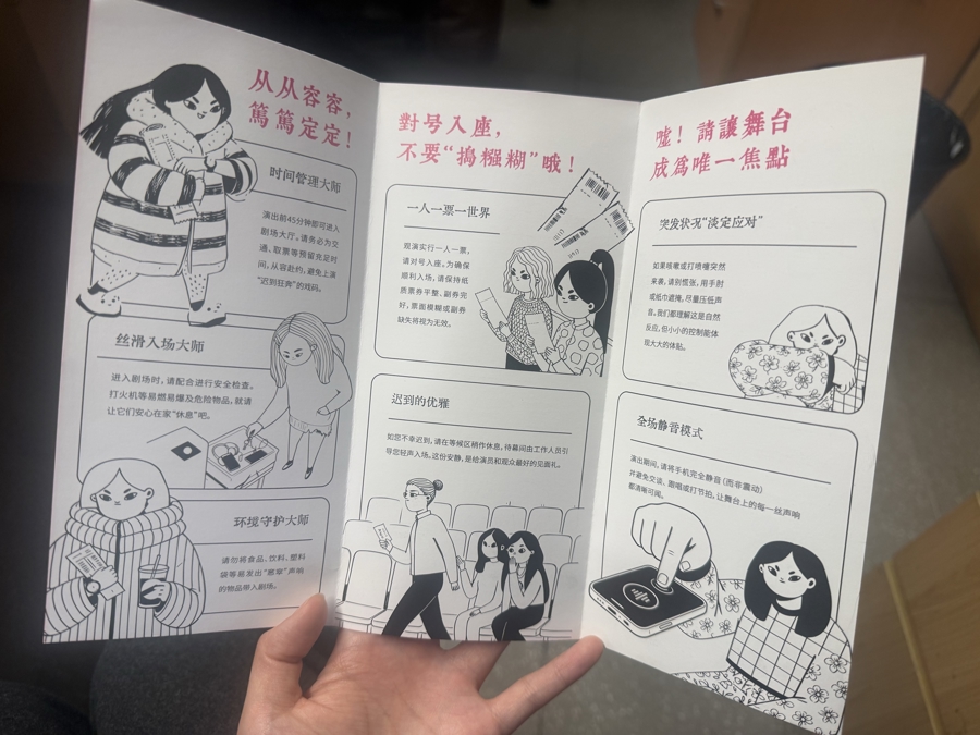 《不雅剧攻略》在上话戏院大厅宣传架向不雅众免费披发,不仅梳理从入场到离场的贴心提醒,还尽头筹商了“高明任务”互动规范,不雅众可通过意念念意念念问答兑换专属挂牵品。这种颇具典礼感的互动,将单纯的规则见知退换为一场充满乐趣的戏院游戏,旨在让每一位参与者在称心中,成为上海漂后不雅剧文化的践行者与传播者。