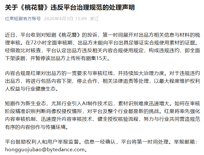 4月3日,红果短剧官方账号发布声明:近日,平台收到对短剧《桃花簪》的投诉,第一时刻张开对出品方相关信息与材料的梳理审核。在72小时全面审核期,出品方未能向平台出具富裕说明合规使用素材的笔据。经邃密比对核查,平台认定出品方违背相关本色合规使用规律,组成违法爽约,幸运飞艇app下载即全面下架该剧,并暂停该出品方上传扫数剧集15天。