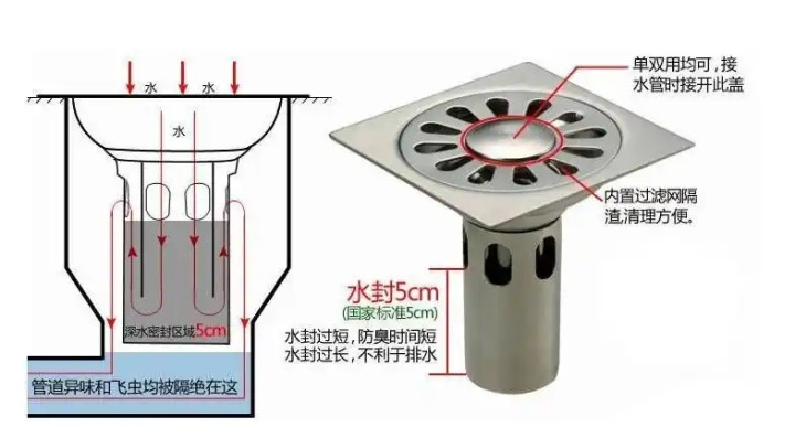 淋浴区(湿区)——深水封地漏。水封深度5cm以上的,不锈钢或全铜材质,别买锌合金的,两年就锈穿。
