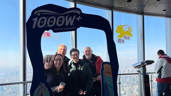 2月9日上昼,来自波兰的马切伊一家步入上海之巅118层不雅光厅,他们也成为了这里第“1000万+”旅客行为中的运道儿。