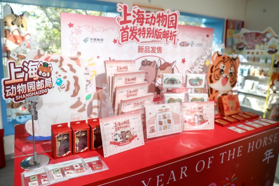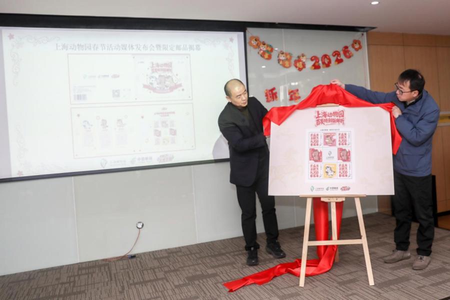 上海动物园副园长马强和上海市邮政分公司市集部、邮务部总司理奚琳共同揭幕邮政联名新品