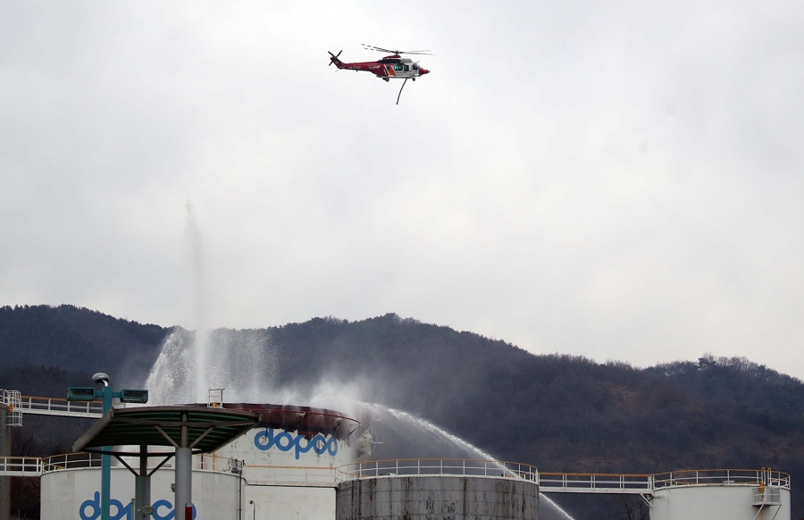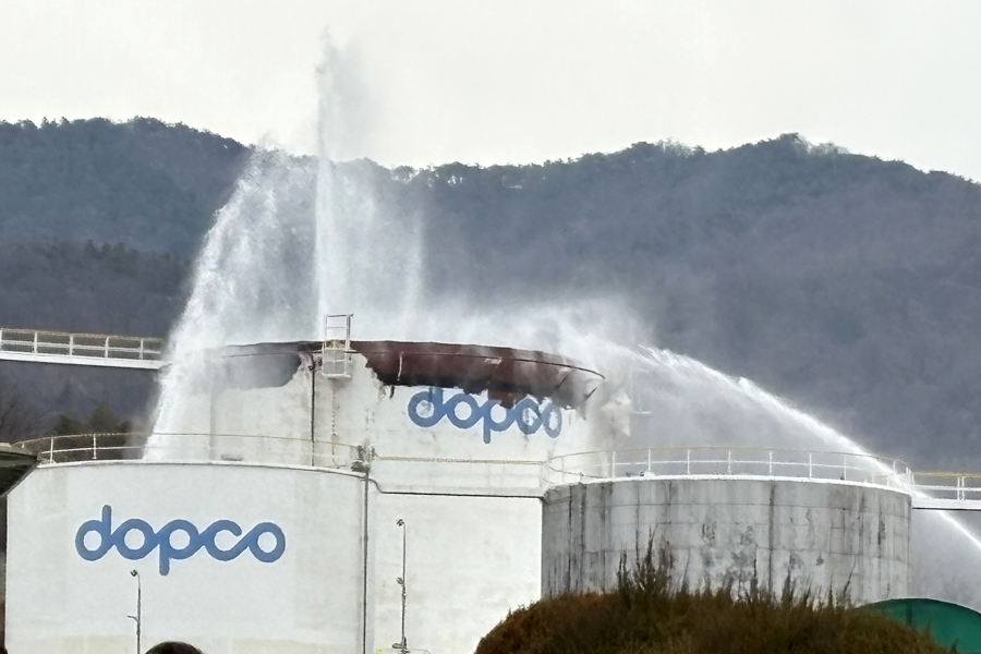 韩国石油管说念公社庆南分公司的室外油罐储存区发生失火,消防部门正在进行熄灭功课。