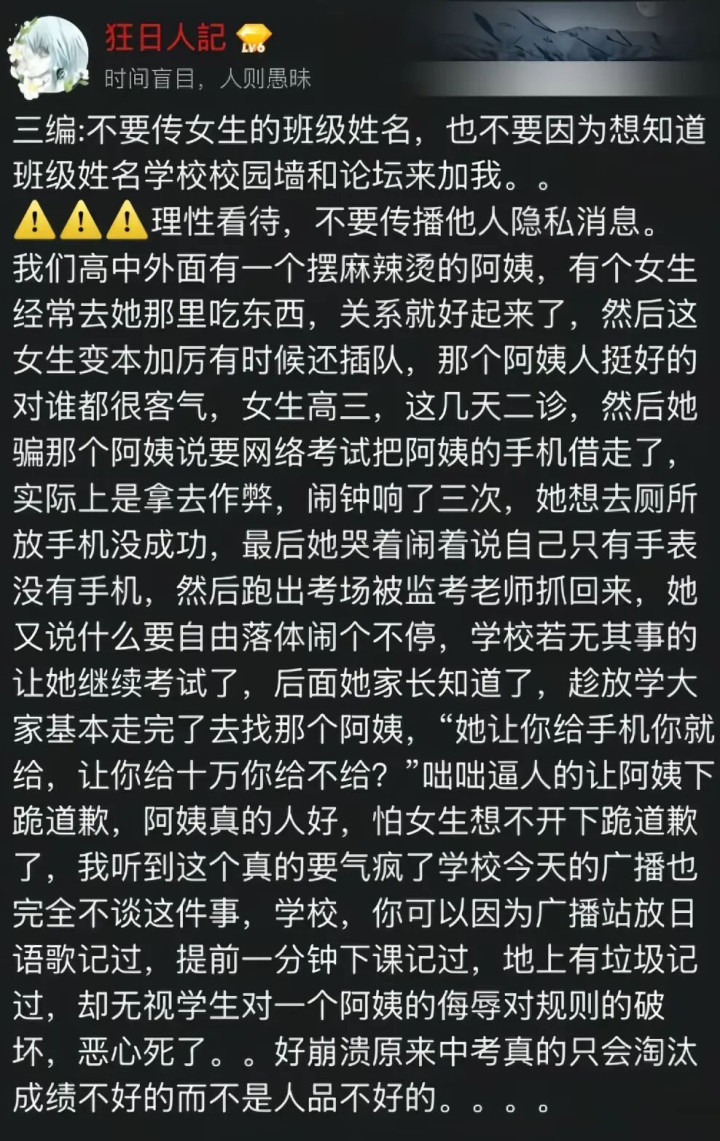 比如,前几天,重庆一位高三女生,因为和学校门口卖麻辣烫的大姨很熟;